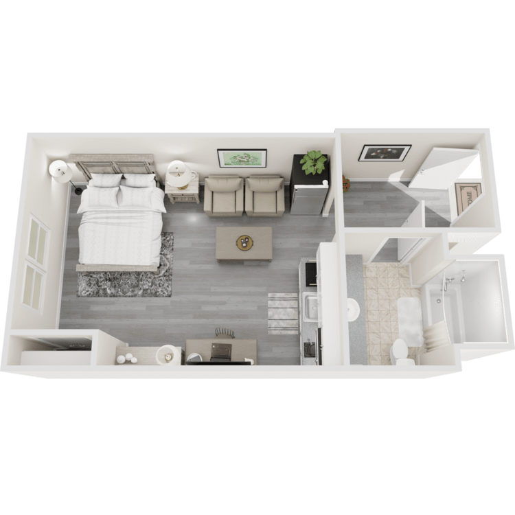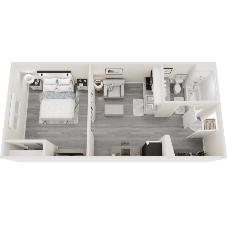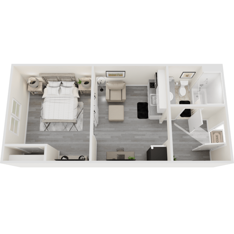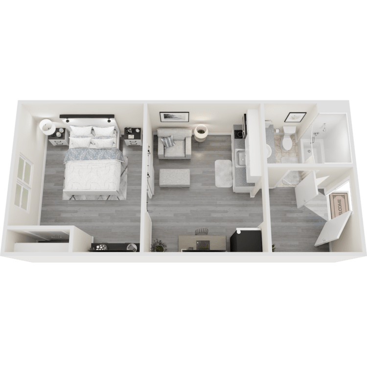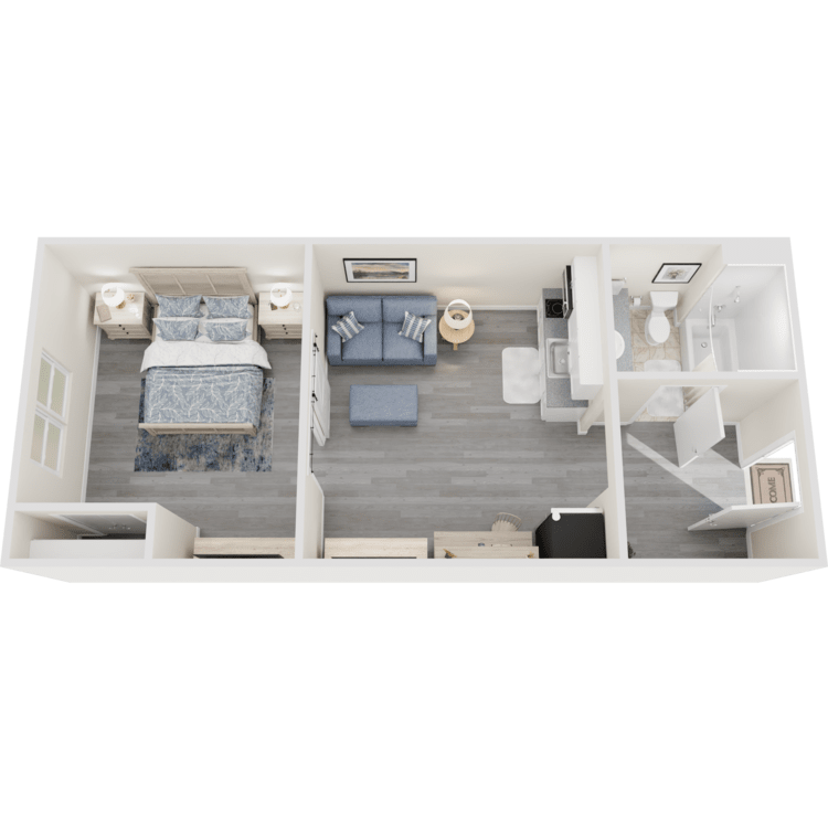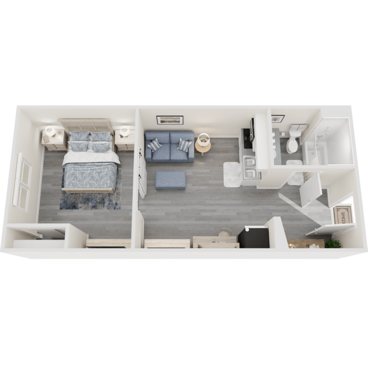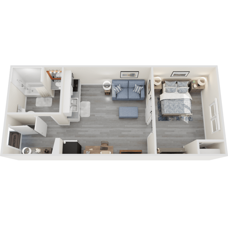 Our pet-friendly, hotel-style studio and en suite one-bedroom apartments for rent in Prescott Valley are both stylish and comfortable. Prepare meals in the kitchenette with stainless steel appliances and quartz countertops. Each furnished apartment features all utilities included, free Wi-Fi, DirecTV with HBO channels included, stunning mountain and valley views, air conditioning, and wood-style flooring. Schedule a tour of our newly renovated hotel living apartments today.